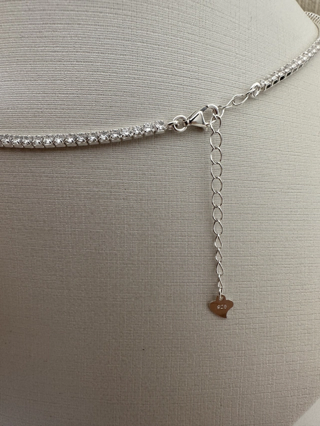 Essa corrente em formato de Riviera em de Prata Italiana 925, é uma jóia maciça com zircônias cristal cravejadas (não vira no pescoço).